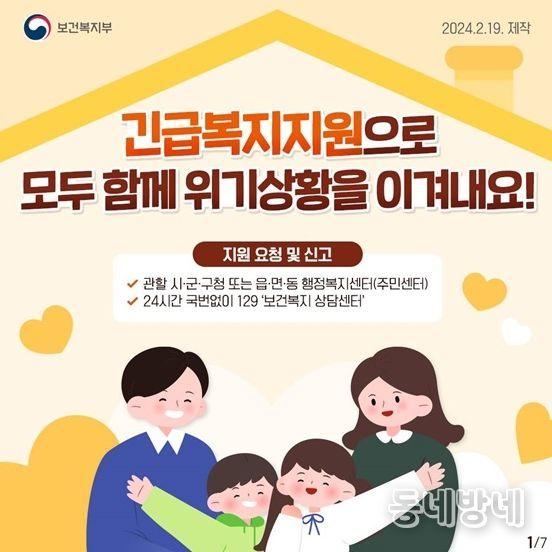 · 보건복지상담센터 국번없이 ☎129, 24시간 긴급복지 상담 시군구로 연계