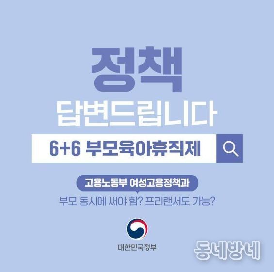 동네방네 김형규 기자 | ‘6+6 부모육아휴직제’에 대한 궁금증을 ‘고용노동부 여성고용정책과’와 함께 국민 여러분의 정책 질문에 답변드립니다.