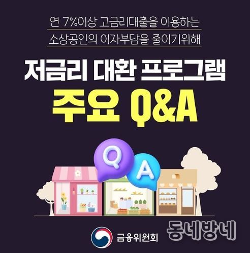동네방네 김형규 기자 | 연 7%이상 고금리대출을 이용하는 소상공인의 이자부담을 줄이기위한 저금리 대환 프로그램 확대 방안의 궁금한점을 알려드립니다.