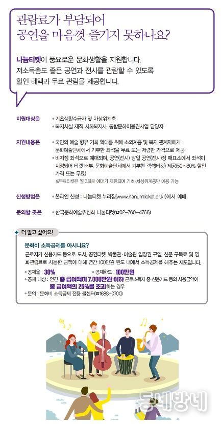저소득층도 좋은 공연과 전시를 관람할 수 있도록 할인 혜택과 무료 관람을 제공합니다.