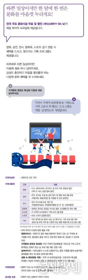 동네방네 김형규 기자 | 전국 주요 문화시설 무료 및 할인 서비스(문화가 있는 날)가 매달 마지막 수요일에 제공됩니다.