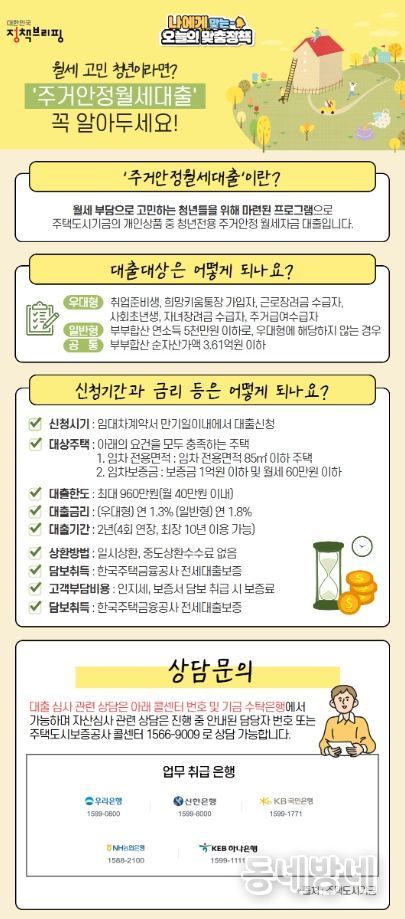 동네방네 김형규 기자 | 월세 부담으로 고민인 청년들에게 청년전용 주거안정 월세자금을 대출해 드립니다.