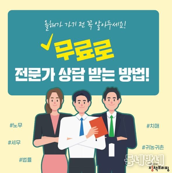 동네방네 김형규 기자 | 일상 생활에서 전문가의 도움이 필요한 경우가 많은데요. 하지만 경제적 이유나 상황에 맞는 전문가를 찾지 못해 상담을 받지 못하는 일도 많습니다. 법률, 세무, 노무, 치매, 귀농귀촌 등의 분야에서 전문가의 심도 깊은 상담을 받을 수 있는 방법을 소개합니다!