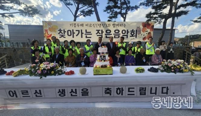 동네방네 김형규 기자 | 소이면 주민자치회는 지난 23일 소이면 행정복지센터 야외무대에서 지역 어르신 10명을 초청해 어르신 생신 잔치 및 찾아가는 작은 음악회를 열었다.