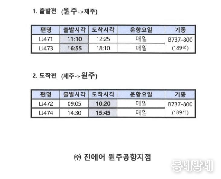 원주공항에 취항한 진에어의 동계 항공기 운항 일정이 국토교통부 최종 승인으로 확정됨에 따라, 10월 26일부터 원주공항에서 출발하는 제주행 항공편은 기존 오전 11시 10분·오후 5시 20분에서 오전 11시 10분·오후 4시 55분으로 변경된다.