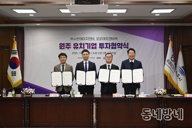 동네방네 김형규 기자 | 원주시는 27일 오전 11시, 강원특별자치도청 신관 2층 소회의실에서 원강수 시장, 김진태 도지사, 이명심 로로에프엔비㈜ 상무이사, 정동인 ㈜수반에이치앤비 대표이사 등이 참석한 가운데 원주 공장 신설을 위한 투자협약을 체결했다.