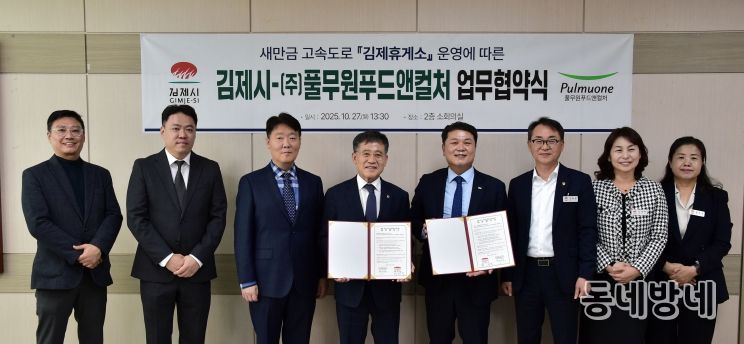 동네방네 김형규 기자 | 김제시는 27일 ㈜풀무원푸드앤컬처와 '새만금전주간' 고속도로 개통에 따라 새롭게 조성되는‘김제휴게소’운영에 따른 업무협약을 체결했다고 밝혔다.