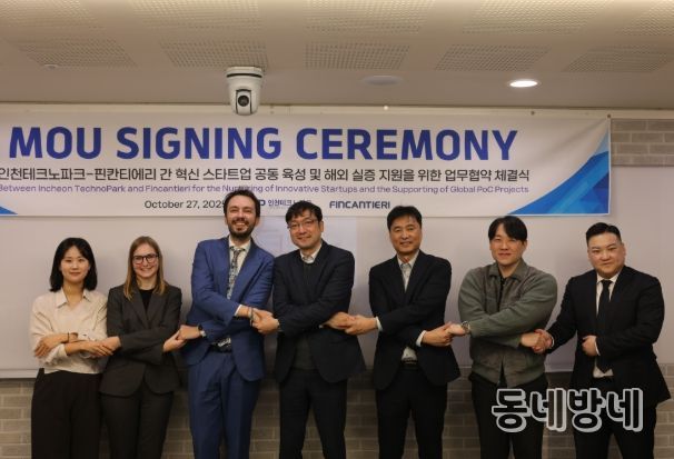 동네방네 김형규 기자 | 인천테크노파크(인천TP)는 27일 인천스타트업파크에서 이탈리아 국영 조선사 핀칸티에리(Fincantieri)와 ‘혁신 스타트업 육성 및 해외 실증 지원’에 상호 협력 내용으로 업무협약을 체결했다.
