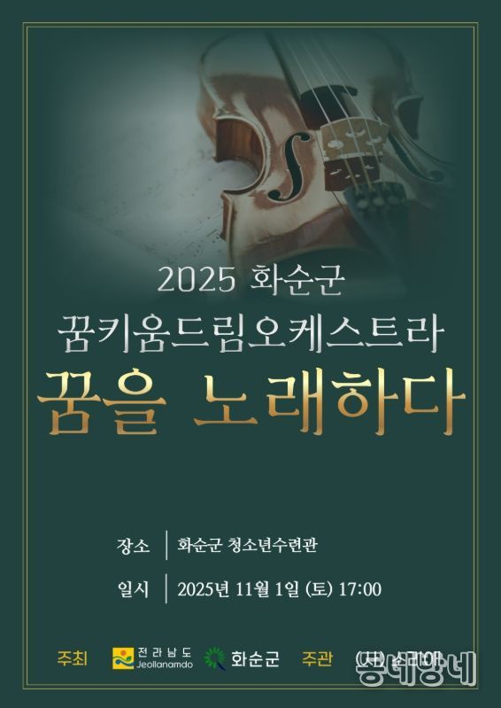동네방네 김형규 기자 | 화순군은 오는 11월 1일 토요일 오후 5시 화순군 청소년수련관에서 화순군 꿈키움 드림오케스트라 연주발표회『꿈을 노래하다』 무료 공연을 개최한다고 밝혔다.