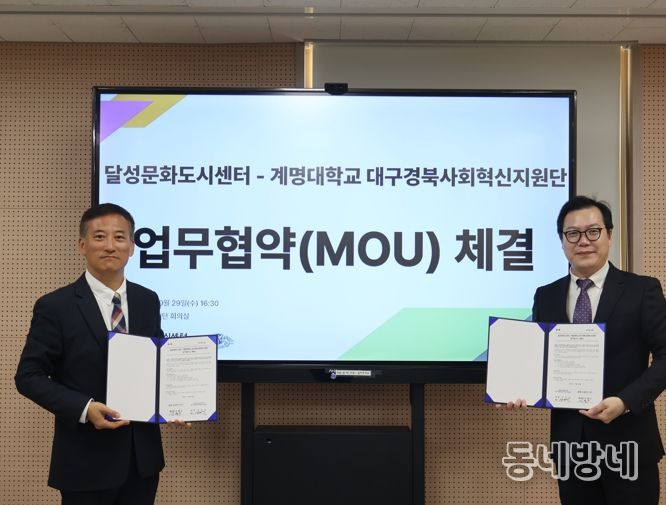 동네방네 김형규 기자 | (재)달성문화재단(이사장 최재훈) 달성문화도시센터는 지난 29일 계명대학교 대구경북사회혁신지원단(단장 신진교)과 업무협약을 체결했다고 밝혔다.