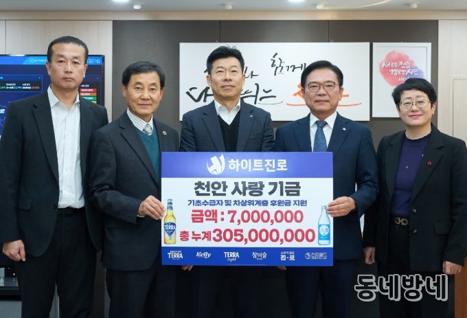 동네방네 김형규 기자 | (재)천안시복지재단은 20일 하이트진로㈜ 천안지점이 취약계층 주민을 위한 후원금 700만 원을 기탁했다고 밝혔다.