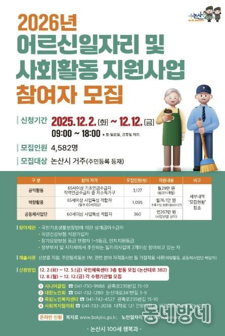 동네방네 김형규 기자 | 논산시는 2026년도 어르신일자리 및 사회활동 지원사업 참여자를 오는 12월 2일부터 12일까지 모집한다고 밝혔다.