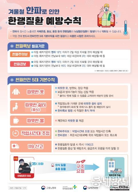 합동점검팀은 현장점검 시, 18개 언어로 제작한 '한파안전 5대 기본수칙' 등을 외국인 노동자와 사업주에게 제공하고 현장 적용 여부를 확인하는 한편, 동상·저체온증 등 예방을 위한 핫팩·귀덮개 등 한랭질환 예방 보조용품도 지원할 예정이다. 특히, 한파주의보 발령 시 작업 시간대를 조정토록(06시→09시) 하고, 한파경보 발령 시에는 옥외작업을 최소화하도록 지도할 예정이다.