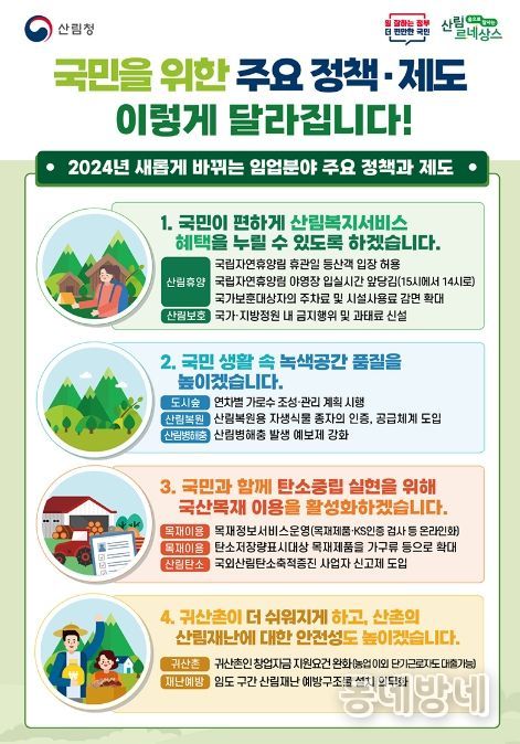 동네방네 김형규 기자 | 2024년 산림청은 국민에게 더 도움이 되고 더 많은 혜택을 드릴 수 있도록 주요정책과 제도를 이렇게 바꾸겠습니다!