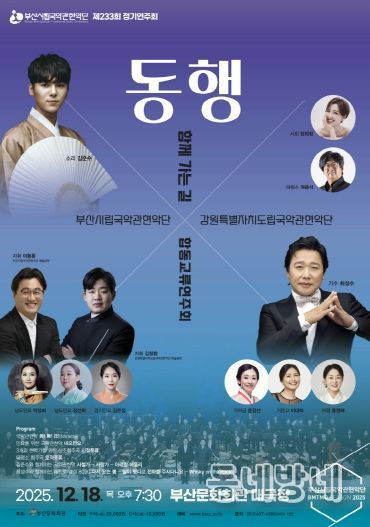 동네방네 김형규 기자 | 부산시립국악관현악단(예술감독 이동훈)의 제233회 정기연주회가 다가오는 12월 18 오후 7시 30분, 부산문화회관 대극장에서 강원특별자치도립국악관현악단 합동교류연주회가 '함께 가는 길, 동행'이라는 부제로 개최된다.