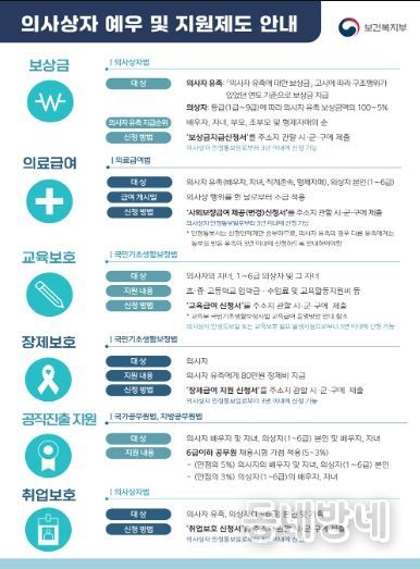 정부는 의사자에 대한 예우를 위해 의사자의 유족에 대하여 보상금, 장제보호, 의료급여 등을 지원하게 된다.