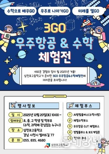 동네방네 김형규 기자 | 삼천포고등학교는 오는 12월 20일 오전 10시부터 교내에서 ‘3GO 우주항공&수학 체험전’을 개최한다.