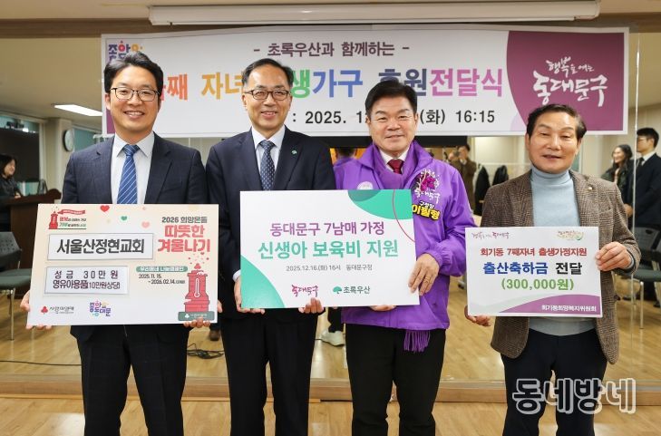 동네방네 김형규 기자 | 서울 동대문구가 관내 ‘일곱째 아이’ 출생 가정을 찾아 축하와 응원의 마음을 전했다. 동대문구는 16일 회기동 주민센터에서 다자녀 가정을 격려하는 행사를 열고, 민간 후원과 연계한 지원 물품과 후원금을 전달했다고 밝혔다.