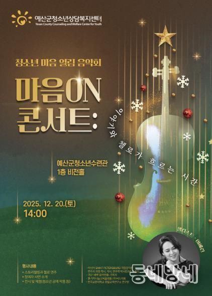 동네방네 김형규 기자 | 예산군청소년상담복지센터는 청소년과 가족의 정서적 치유를 돕기 위한 문화예술 프로그램으로 ‘청소년 마음 열림음악회 마음 온(ON) 콘서트’를 오는 20일 개최한다.