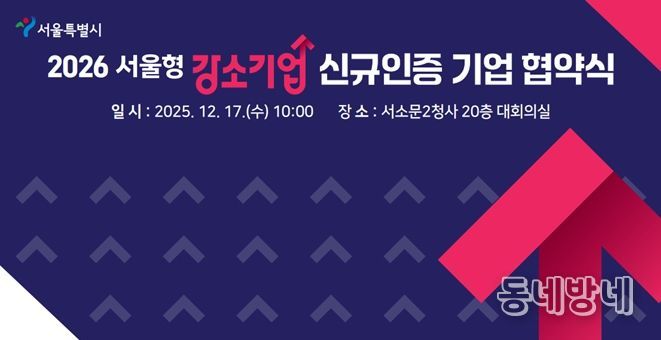 서울시는 지난 9월 ‘2026년 서울형 강소기업’으로 신규 인증한 48개사와 청년 정규직 채용 확대 및 일·생활 균형이 가능한 근무환경 조성을 약속하는 '2026년 서울형 강소기업 신규 인증 협약식'을 12월 17일(수) 서울시청 서소문2청사에서 개최했다고 밝혔다.