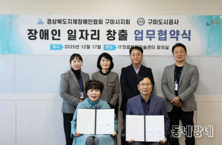 동네방네 김형규 기자 | 구미도시공사는 지난 12월 17일, (사)경북지체장애인협회 구미시지회와 장애인 일자리 창출을 위한 업무협약을 체결했다. 이번 협약은 공공기관과 장애인 단체 간 협력체계를 구축해 장애인의 안정적인 고용기회를 확대하고, 지역사회 내 지속 가능한 일자리 모델을 발굴하기 위해 마련됐다.