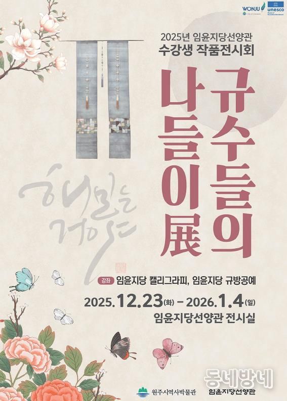 동네방네 김형규 기자 | 원주시 임윤지당선양관은 오는 23일부터 내년 1월 4일까지 선양관 전시실에서 수강생 작품전시회 ‘규수들의 나들이展(전)’을 개최한다.