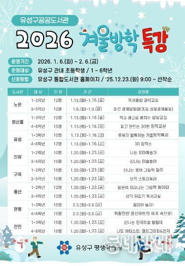 동네방네 김형규 기자 | 대전 유성구는 내년 1월 6일부터 2월 6일까지 관내 8개 공공도서관에서 초등학생 대상으로 ‘겨울방학 특강’을 운영한다.