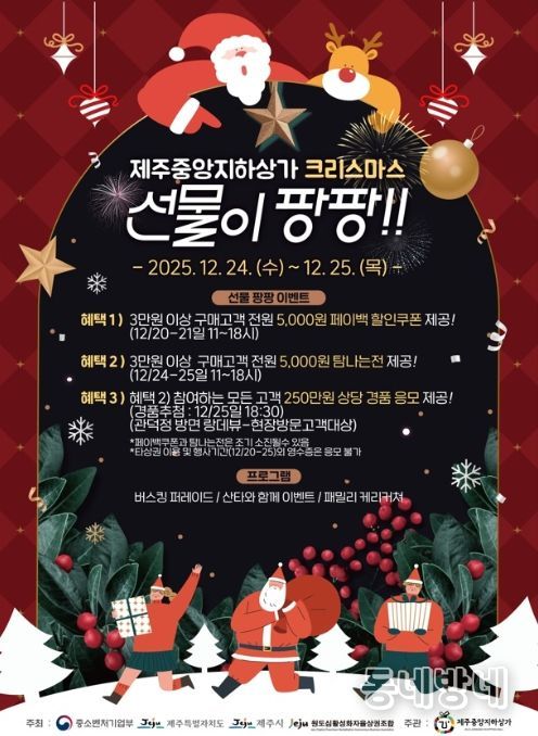 동네방네 김형규 기자 | 제주시는 12월 24일과 25일 오전 11시부터 오후 6시까지 제주중앙지하상가 일대에서 ‘크리스마스: 선물이 팡팡’ 세일 페스타를 개최한다고 밝혔다.