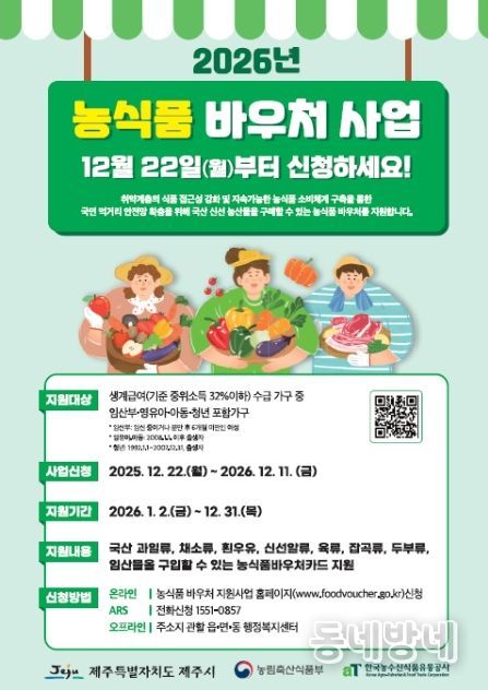 동네방네 김형규 기자 | 제주시는 취약계층의 식생활 안정을 지원하고 건강한 먹거리 접근성을 높이기 위해 ‘2026년도 농식품바우처 사업’ 신청 접수를 12월 22일부터 시작한다.