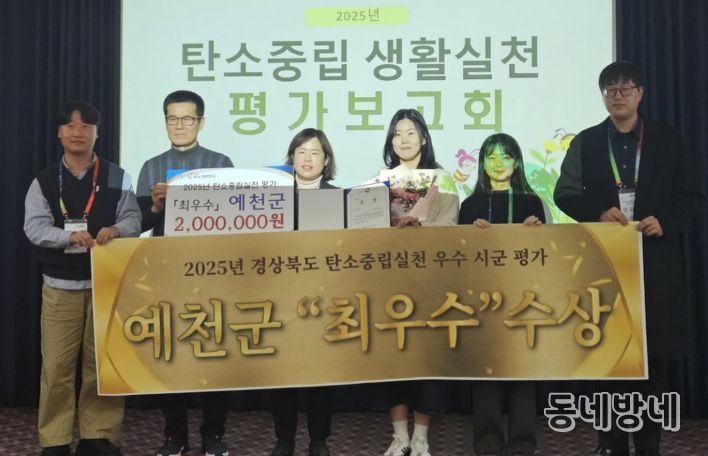 동네방네 김형규 기자 | 예천군은 19일 구미 호텔금오산에서 열린 ‘2025년 탄소중립실천 우수시군 평가보고회’에서 ‘최우수상’을 수상했다.