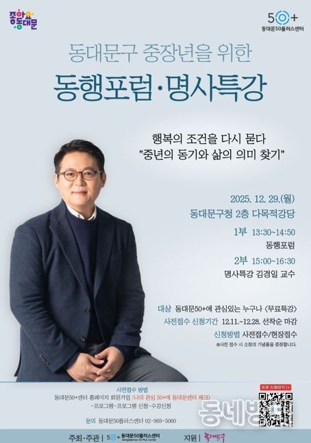 동네방네 김형규 기자 | 서울 동대문구가 중장년의 ‘인생 2막’ 설계를 돕기 위한 공개 포럼과 특강을 연다. 동대문구는 29일 오후 1시 30분 구청 2층 다목적강당에서 ‘동대문50플러스센터 동행포럼·명사특강’을 개최한다고 밝혔다. 2026년 상반기 개관을 앞둔 동대문50플러스센터의 운영 방향을 주민과 공유하고, 지역 여건에 맞는 프로그램을 함께 모색하기 위한 자리다.