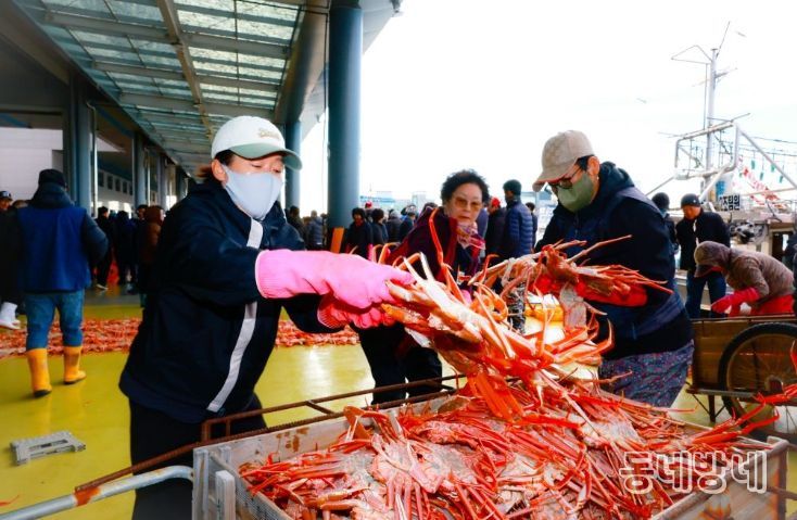 동네방네 김형규 기자 | 차가운 겨울 바다의 진미 울진대게가 죽변항과 후포항을 붉게 물들인다.