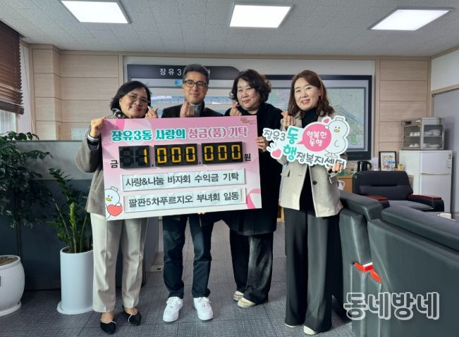 팔판마을5차푸르지오아파트 부녀회(회장 송정옥)는 19일, 장유3동 행정복지센터에서 ‘사랑&나눔 바자회’ 수익금 1백만원을 전달하는 성금 기탁식을 가졌다.