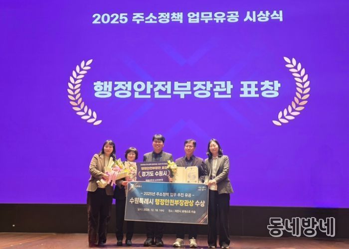 동네방네 김형규 기자 | 수원특례시가 행정안전부 주관 ‘2025 주소정책 워크숍’에서 ‘2025 주소정책 업무 분야 우수기관’으로 선정돼 행정안전부 장관 표창을 받았다. 특별교부세 4000만 원도 확보했다.