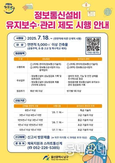 동네방네 김형규 기자 | 울산 남구는 연면적 5,000㎡ 이상 건축물의 정보통신설비 유지보수‧관리자 선임을 의무화하는 ‘정보통신설비 유지보수‧관리 제도’를 지난 7월 19일부터 시행하고 있다고 밝혔다.