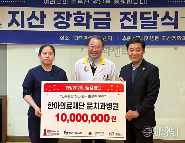 동네방네 김형규 기자 | (재)천안시복지재단은 지난 22일 한아의료재단 문치과병원이 학업장려금 3,000만 원을 기탁했다고 밝혔다.
