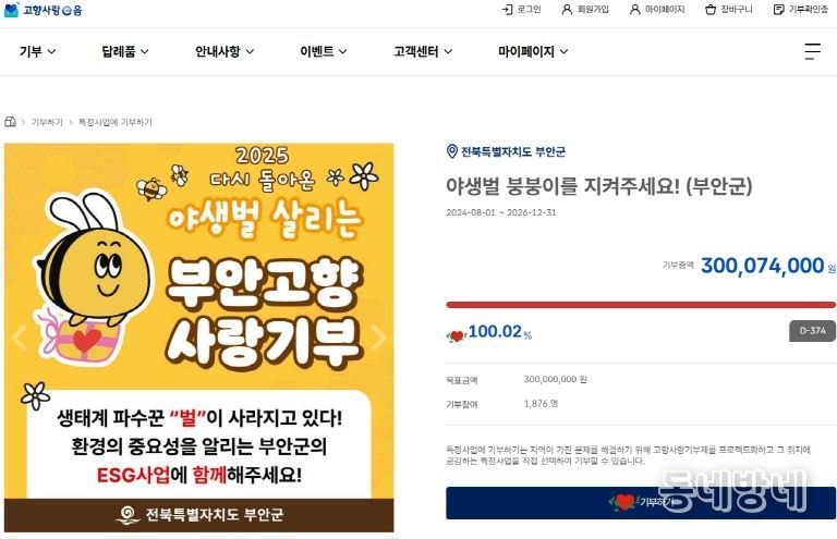 동네방네 김형규 기자 | 부안군은 고향사랑기부제 지정기부 ESG 사업으로 추진한 ‘야생벌 붕붕이를 지켜주세요!’ 프로젝트가 기부자들의 꾸준한 참여 속에 목표 모금액 3억원을 달성했다고 밝혔다.