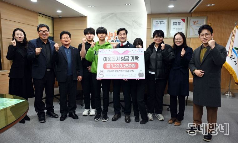 동네방네 김형규 기자 | 밀양시는 지난 22일 청소년문화의집 소속 청소년들이 시장실을 방문해 직접 운영한 일일카페 수익금 122만 3,250원을 연말 이웃돕기 성금으로 기부했다고 밝혔다.