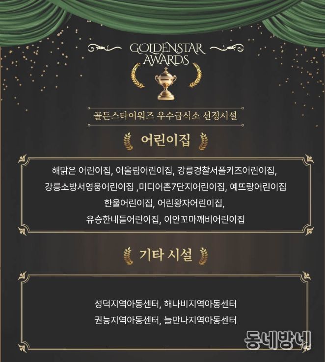 동네방네 김형규 기자 | 강릉시 어린이·사회복지급식관리지원센터는 관내 어린이집·유치원 및 기타 시설을 대상으로 2025년 한 해 동안 센터에서 운영한 사업과 프로그램에 적극 참여하고 위생·영양·안전관리 실천 수준이 우수한 14개소 급식소를 '우수급식소 골든스타어워즈'로 선정하여 우수기관 인증 현판을 전달했다.