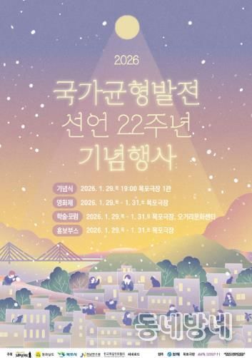 동네방네 김형규 기자 | 목포시는 노무현재단, 전라남도와 함께 국가균형발전선언 22주년을 맞아 1월 29일부터 31일까지 3일간 목포극장과 오거리문화센터 일원에서 ‘국가균형발전선언 22주년 기념행사’를 개최한다고 밝혔다.