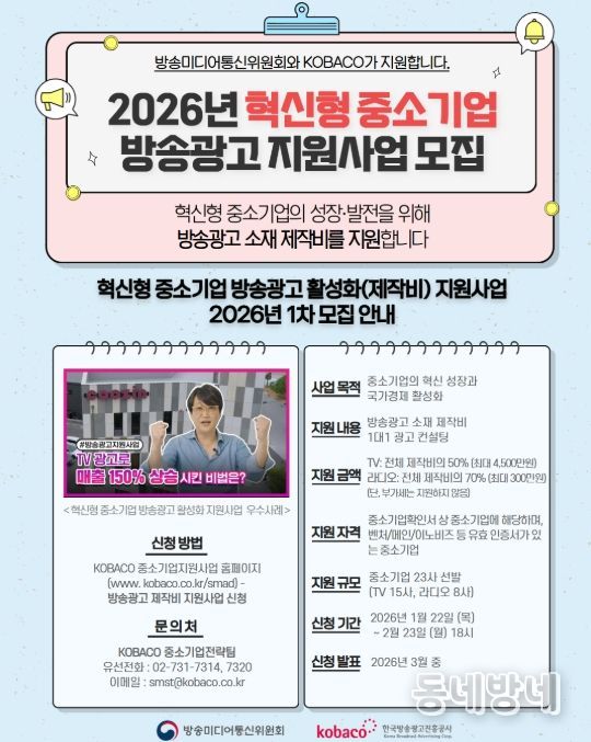 방송미디어통신위원회와 한국방송광고진흥공사는 22일 ‘2026년 중소기업‧소상공인 방송광고 제작지원사업’ 공개모집을 22일부터 한 달여간 진행한다고 밝혔다.