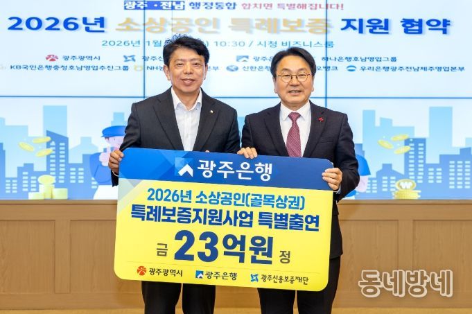 동네방네 김형규 기자 | 광주은행은 22일 광주광역시청에서 강기정 광주광역시장, 정일선 광주은행장, 염규송 광주신용보증재단 이사장 및 관계자가 참석한 가운데 ‘2026년 소상공인 특례보증 대출 지원사업 협약’을 체결했다고 밝혔다.