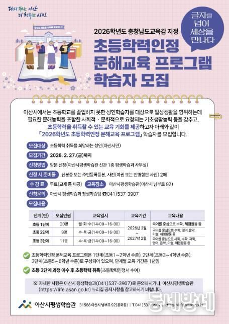동네방네 김형규 기자 | 아산시는 초등학교 과정을 마치지 못한 성인을 대상으로 생활 전반에 필요한 기초 문해 능력과 사회·문화적 적응 역량을 기를 수 있도록 ‘2026학년도 초등학력인정 문해교육 프로그램’을 운영하고, 이에 참여할 학습자를 모집한다.