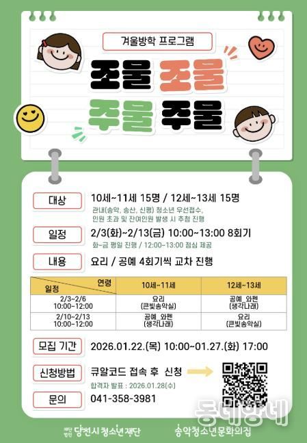 이번 프로그램은 2026년 2월 3일(화)부터 2월 13일(금)까지, 오전 10시부터 오후 1시까지 진행되며(12:00~13:00 점심시간 포함), 송악·송산·신평 지역에 거주하는 청소년 30명을 대상으로 한다.