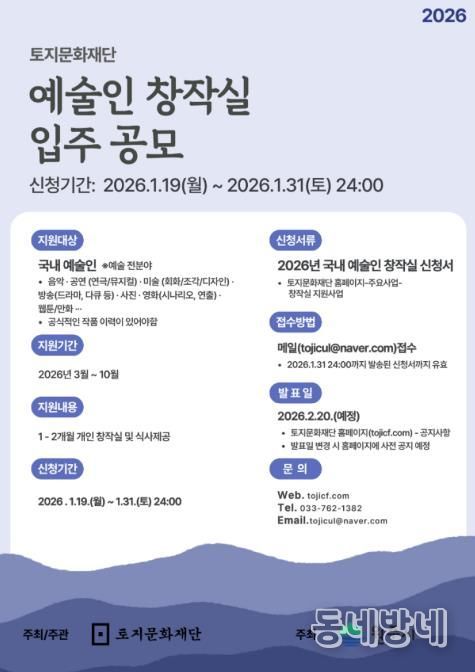 동네방네 김형규 기자 | 토지문화재단은 예술인들이 창작활동에 전념할 수 있도록 올해 토지문화관 예술인 창작실 입주 희망자를 오는 31일까지 공개 모집한다.