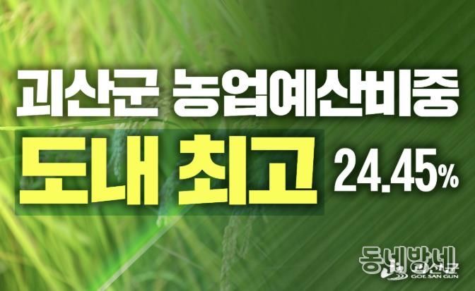 군이 23일 공개한 2026년 시·군별 예산 현황에 따르면 괴산군의 본예산 대비 농업 부문 예산 비율은 24.45%로 충북 11개 시·군 가운데 1위에 올랐다. 도 전체 평균(11.86%)과 비교해도 두 배를 훌쩍 넘는 지원이다.