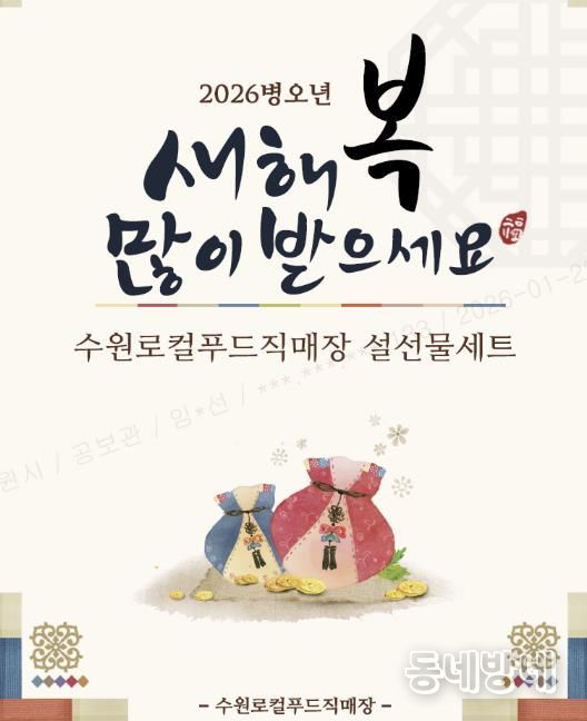 동네방네 김형규 기자 | 수원로컬푸드직매장이 설 명절을 맞아 1월 26일부터 2월 9일까지 우리 농산물로 구성된 ‘설 명절 선물 세트’ 사전예약 판매를 한다. 택배 신청은 2월 9일 오전까지 할 수 있고, 배송은 2월 9~13일 이뤄진다.