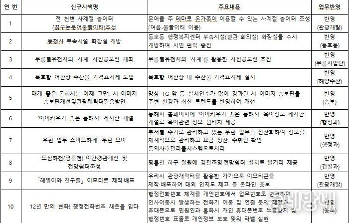 동해시는 지난 2024년부터 직원 제안 정책 발굴 제도를 운영해 왔으며, 직원들이 제안한 아이디어 55건 가운데 10건의 신규 시책을 실제 시정에 반영해 추진하는 성과를 거뒀다.
