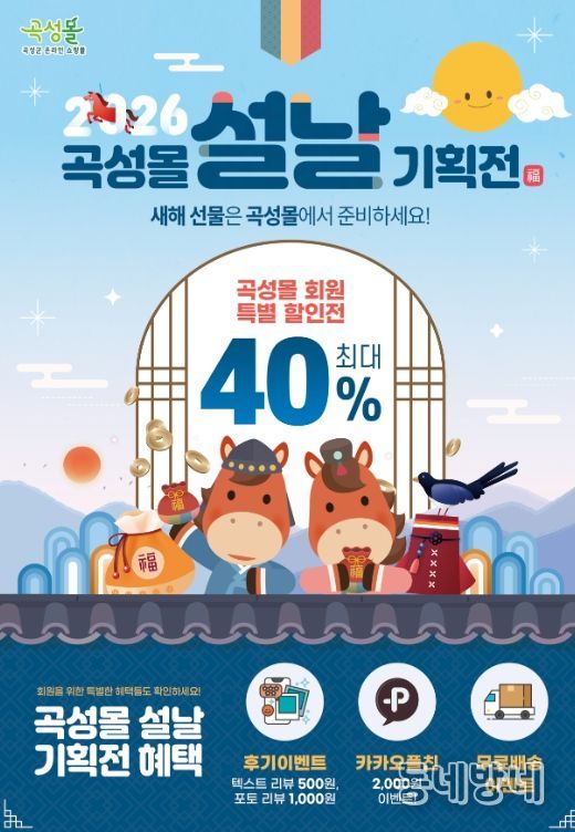 동네방네 김형규 기자 | 전남 곡성군은 설 명절을 맞아 온라인 쇼핑몰 곡성몰에서 곡성몰 福(복) 가득 최대 40% 할인 특별전을 운영한다고 26일 밝혔다.