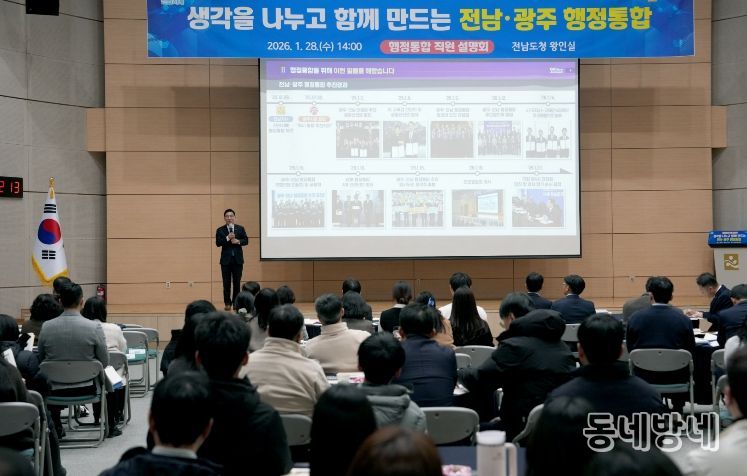 동네방네 김형규 기자 | 전라남도는 28일 도청 왕인실에서 직원들을 대상으로 ‘전남·광주 행정통합 직원설명회’를 열고, 추진 경과와 주요 쟁점을 공유하며 직원 의견을 청취했다.